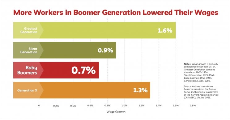 - Boomers’ (born 1948 to 1964) real wages adjusted for in ation grew less than other generations. Boomers’ wages grew an average of 3.9% a year when they were young and 0.7% when they were prime-aged, compared to 5.0% and 0.9% for the Silent Generation (born 1925 to 1947) and 6.3% and 1.3% for Generation X (born 1965 to 1982).