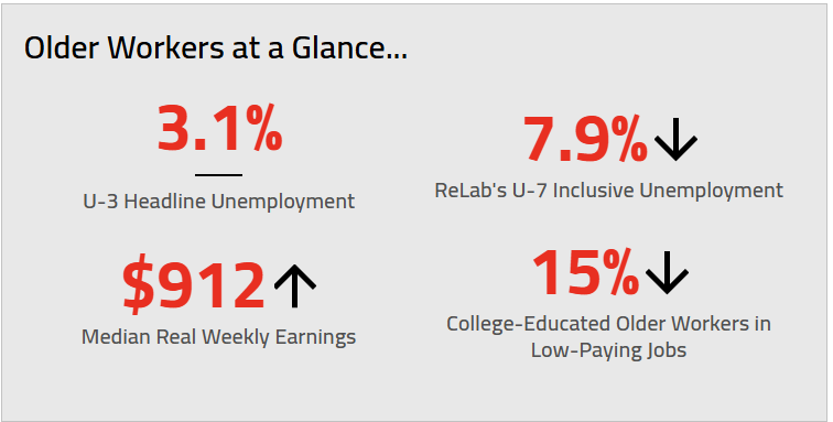 **Arrows next to "Older Workers at a Glance" statistics reflect the change from the previous month's data for the U-3 and U-7 unemployment rate and the last quarter's data for the median real weekly earnings and low-paying jobs.