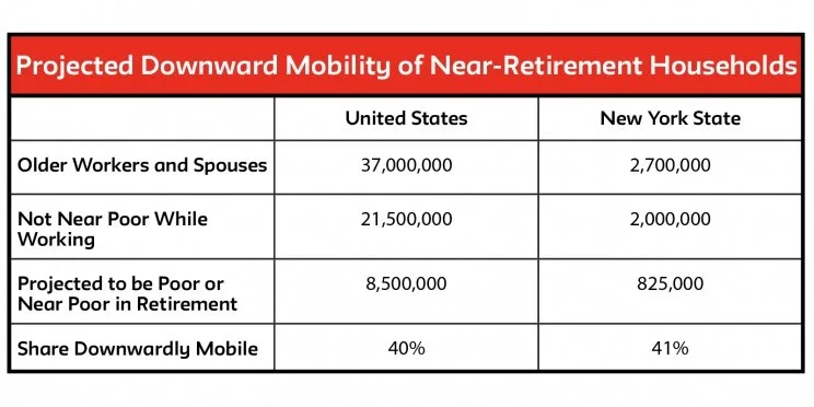 - ReLab projects that out of 2 million older workers in New York State ages 50-60 and their spouses who are not poor or near poor, 825,000 – or 41% – will fall into poverty or near poverty when they retire at 62.